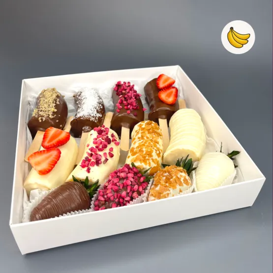 Состав: бананы в шоколаде 8 шт., клубника в шоколаде 4 шт. Свежие бананы в бельгийском шоколаде — идеальный способ выразить чувства: ко дню рождения, годовщине, 8 Марта, 14 Февраля, Дню матери, Дню учителя, Дню бабушки и дедушки или просто в знак внимания и заботы. Фирменная открытка-инструкция по хранению — в подарок. Коробочка бананов в шоколаде — отличный подарок бабушке, маме, любимой женщине, жене, подруге, сестре, друзьям и коллеге.