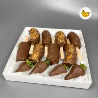 Мы собираем клубничные букеты по весу, а не по штукам. Количество, форма и размер ягод могут отличаться — ведь каждая ягода уникальна.