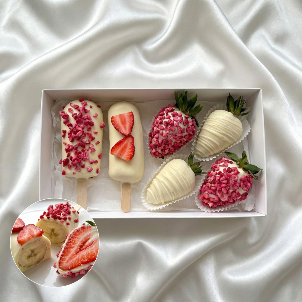 Бананы в шоколаде, Клубника в шоколаде, Клубника без шоколада, Посыпки: Сублимированная малина