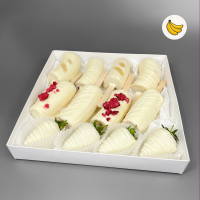 Мы собираем клубничные букеты по весу, а не по штукам. Количество, форма и размер ягод могут отличаться — ведь каждая ягода уникальна.