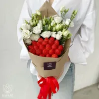 Мы собираем клубничные букеты по весу, а не по штукам. Количество, форма и размер ягод могут отличаться — ведь каждая ягода уникальна.
