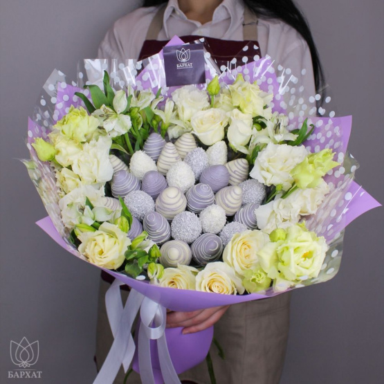 Букет из свежей клубники в бельгийском шоколаде и живых цветов. Клубника держится на каркасе из шпажек. Ягода отделена от цветов прозрачной пленкой. Готовый букет упаковывается в прозрачную слюду.