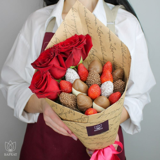 Этот букет — идеальный способ выразить чувства: ко дню рождения, годовщине, 8 Марта, 14 Февраля, Дню матери, Дню учителя, Дню бабушки и дедушки или просто в знак внимания и заботы. Букет из клубники и цветов — съедобный букет — отличный подарок бабушке, маме, любимой женщине, жене, подруге, сестре, друзьям и коллеге.