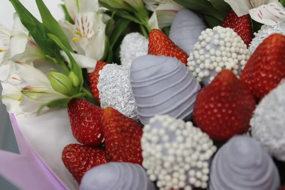 Мы собираем клубничные букеты по весу, а не по штукам. Количество, форма и размер ягод могут отличаться — ведь каждая ягода уникальна.