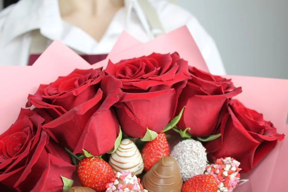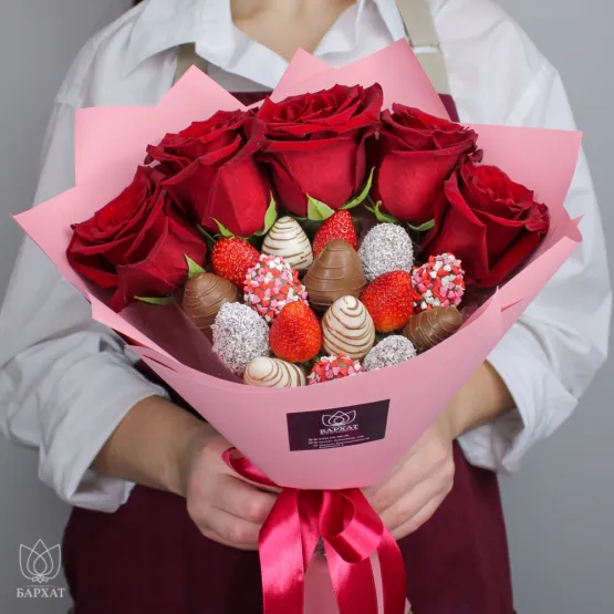 Этот букет — идеальный способ выразить чувства: ко дню рождения, годовщине, 8 Марта, 14 Февраля, Дню матери, Дню учителя, Дню бабушки и дедушки или просто в знак внимания и заботы. Букет из клубники и цветов — съедобный букет — отличный подарок бабушке, маме, любимой женщине, жене, подруге, сестре, друзьям и коллеге.