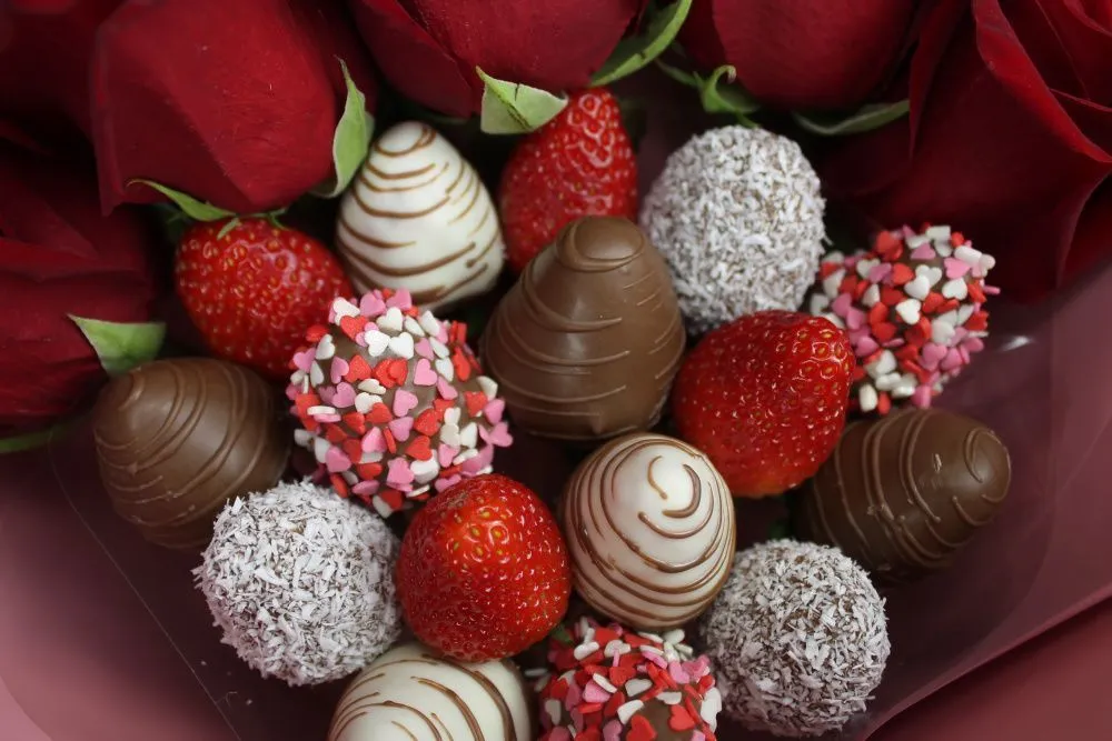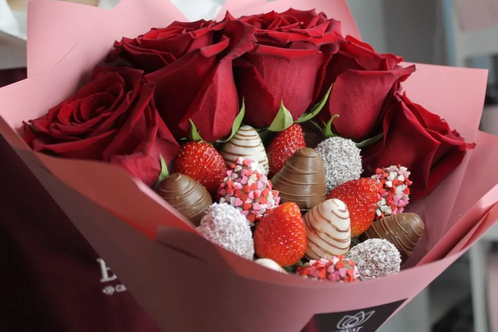 Мы собираем клубничные букеты по весу, а не по штукам. Количество, форма и размер ягод могут отличаться — ведь каждая ягода уникальна.