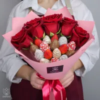 Букет из свежей клубники в бельгийском шоколаде и живых цветов. Клубника держится на каркасе из шпажек. Ягода отделена от цветов прозрачной пленкой. Готовый букет упаковывается в прозрачную слюду.
