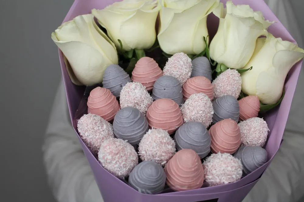 Мы собираем клубничные букеты по весу, а не по штукам. Количество, форма и размер ягод могут отличаться — ведь каждая ягода уникальна.
