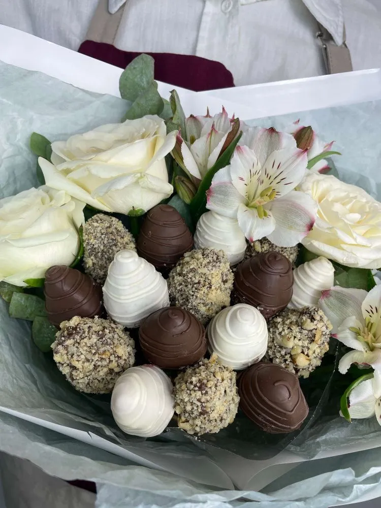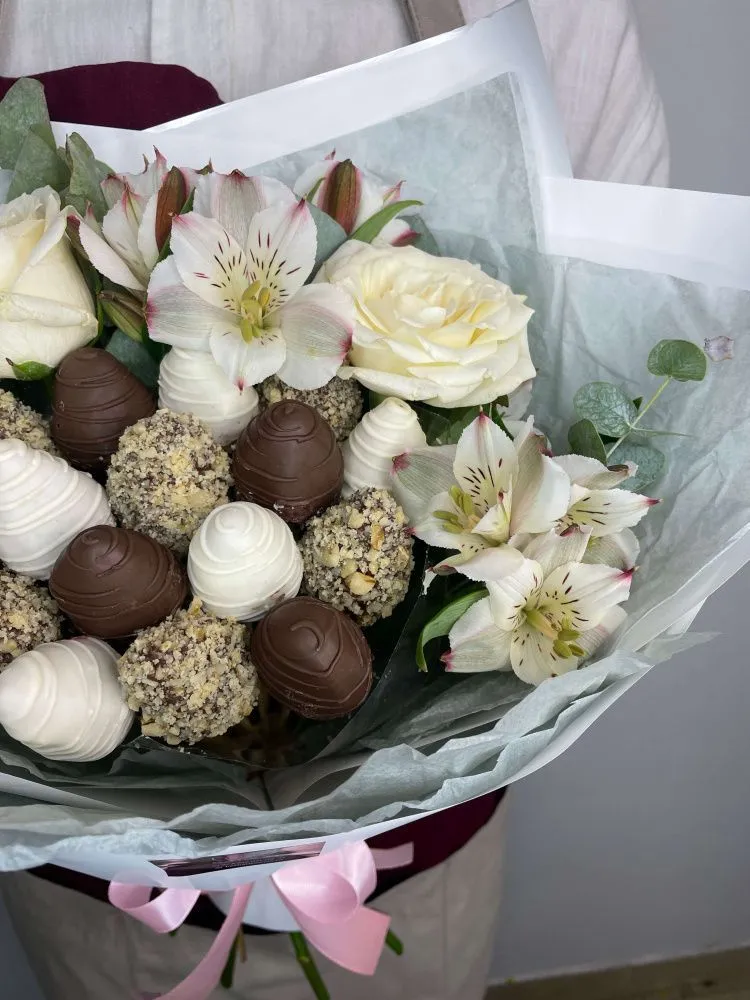 Этот букет — идеальный способ выразить чувства: ко дню рождения, годовщине, 8 Марта, 14 Февраля, Дню матери, Дню учителя, Дню бабушки и дедушки или просто в знак внимания и заботы. Букет из клубники и цветов — съедобный букет — отличный подарок бабушке, маме, любимой женщине, жене, подруге, сестре, друзьям и коллеге.