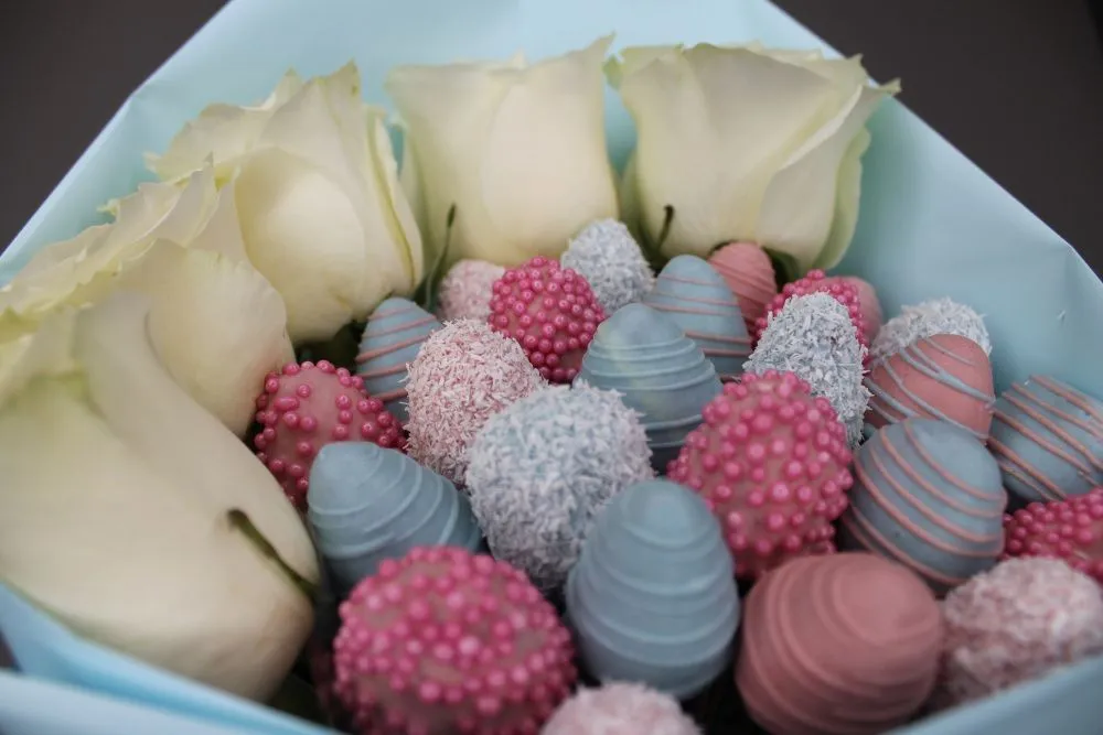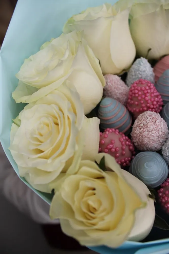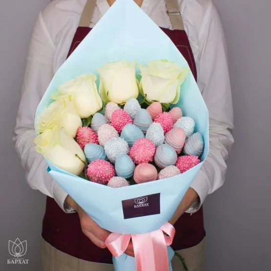 Мы собираем клубничные букеты по весу, а не по штукам. Количество, форма и размер ягод могут отличаться — ведь каждая ягода уникальна.