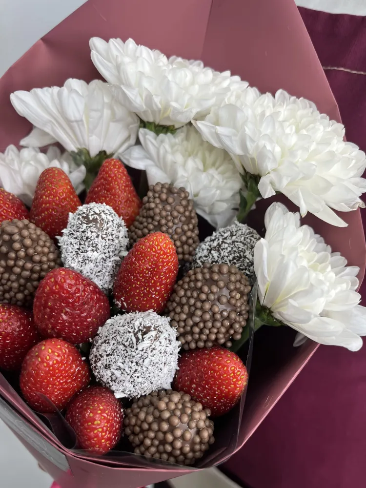 Букет из свежей клубники в бельгийском шоколаде и живых цветов. Клубника держится на каркасе из шпажек. Ягода отделена от цветов прозрачной пленкой. Готовый букет упаковывается в прозрачную слюду. Фирменная открытка-инструкция по хранению — в подарок. Этот букет — идеальный способ выразить чувства: ко дню рождения, годовщине, 8 Марта, 14 Февраля, Дню матери, Дню учителя, Дню бабушки и дедушки или просто в знак внимания и заботы. Букет из клубники и цветов — съедобный букет — отличный подарок бабушке, маме, любимой женщине, жене, подруге, сестре, друзьям и коллеге.