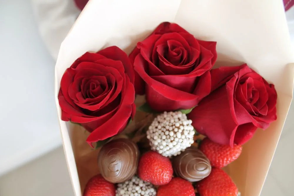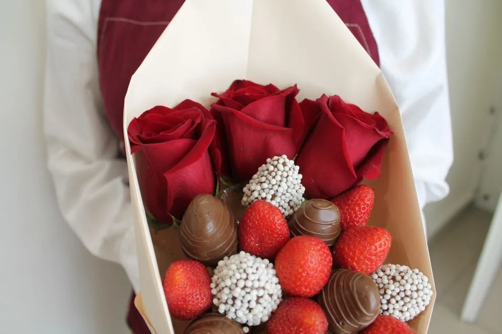 Мы собираем клубничные букеты по весу, а не по штукам. Количество, форма и размер ягод могут отличаться — ведь каждая ягода уникальна.