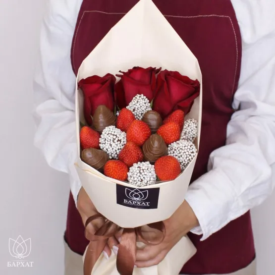 Букет из свежей клубники в бельгийском шоколаде и живых цветов. Клубника держится на каркасе из шпажек. Ягода отделена от цветов прозрачной пленкой. Готовый букет упаковывается в прозрачную слюду.