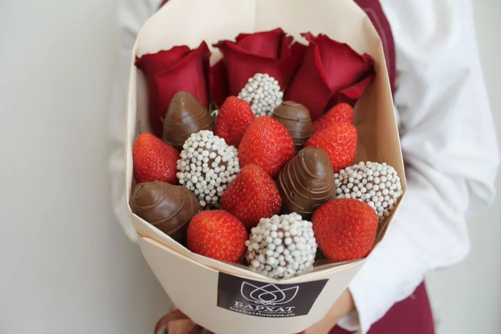 Этот букет — идеальный способ выразить чувства: ко дню рождения, годовщине, 8 Марта, 14 Февраля, Дню матери, Дню учителя, Дню бабушки и дедушки или просто в знак внимания и заботы. Букет из клубники и цветов — съедобный букет — отличный подарок бабушке, маме, любимой женщине, жене, подруге, сестре, друзьям и коллеге.