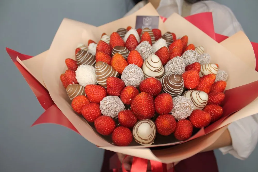 *Обратите внимание: изображение в карточке товара носит иллюстративный характер — реальный букет может незначительно отличаться от фото (например, по размеру клубники, форме и сборке). Точные размеры букета указаны в карточке товара.