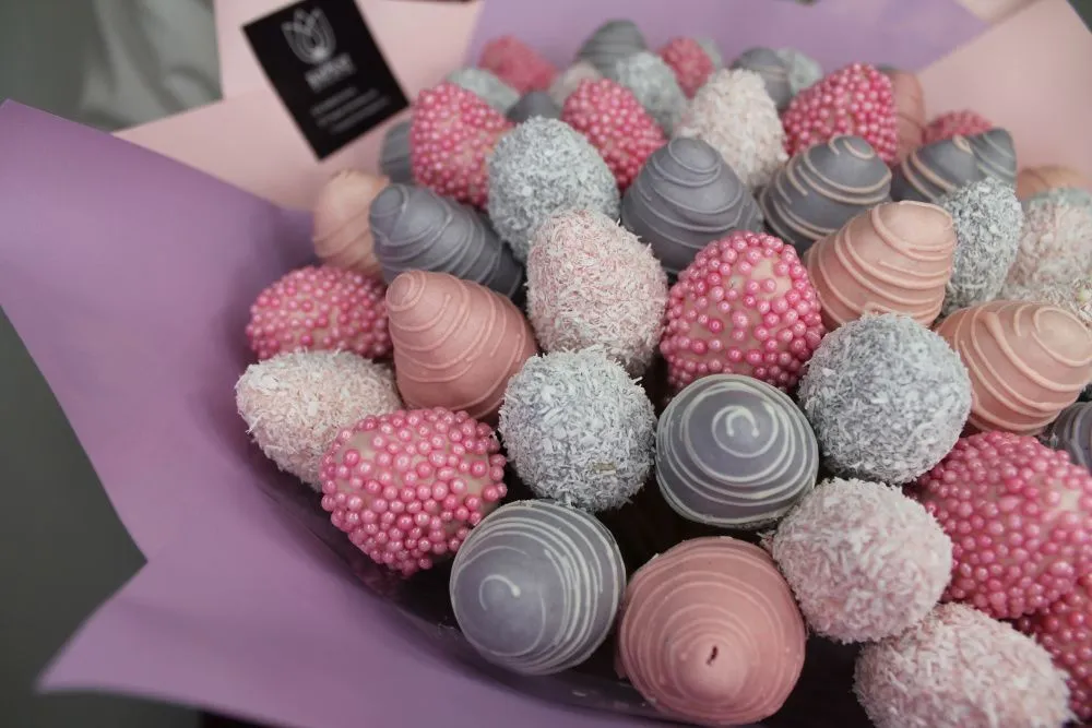 Мы собираем клубничные букеты по весу, а не по штукам. Количество, форма и размер ягод могут отличаться — ведь каждая ягода уникальна.