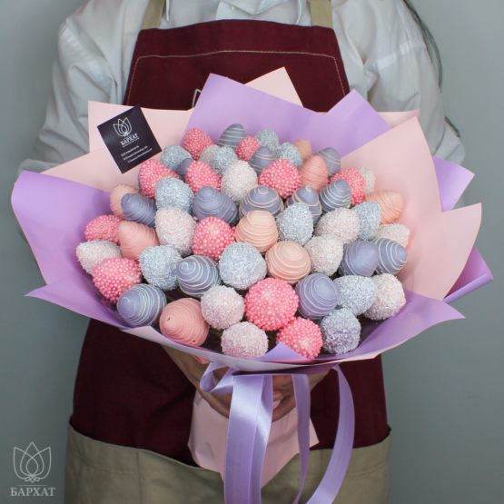 *Обратите внимание: изображение в карточке товара носит иллюстративный характер — реальный букет может незначительно отличаться от фото (например, по размеру клубники, форме и сборке). Точные размеры букета указаны в карточке товара.