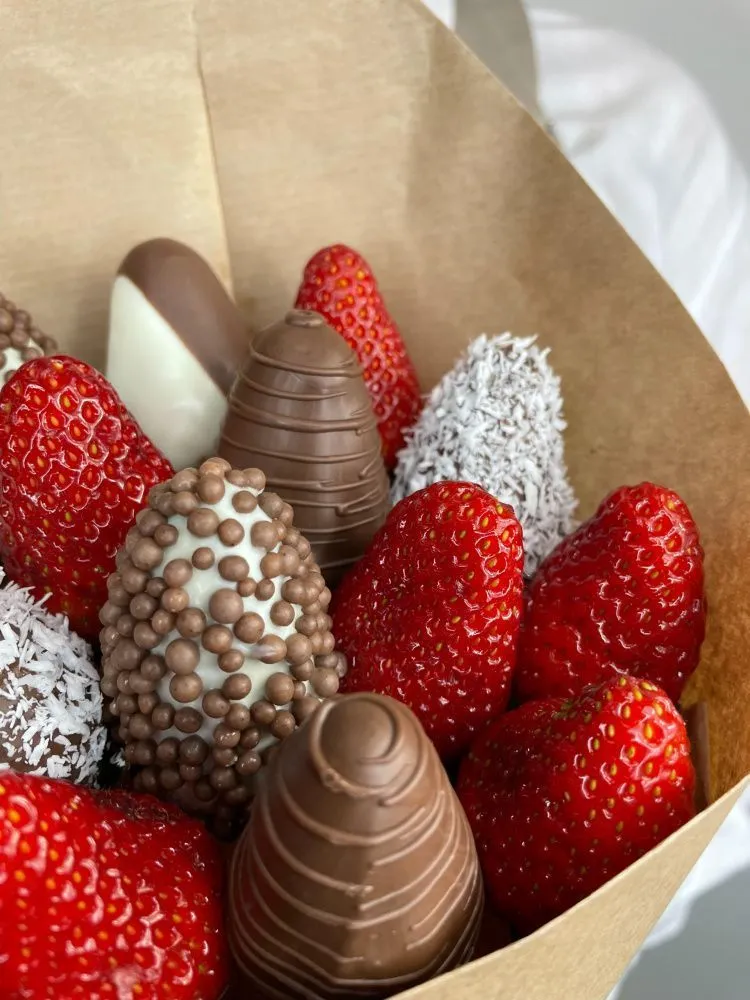 Мы собираем клубничные букеты по весу, а не по штукам. Количество, форма и размер ягод могут отличаться — ведь каждая ягода уникальна.