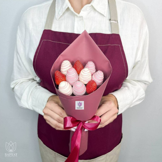 *Обратите внимание: изображение в карточке товара носит иллюстративный характер — реальный букет может незначительно отличаться от фото (например, по размеру клубники, форме и сборке). Точные размеры букета указаны в карточке товара.