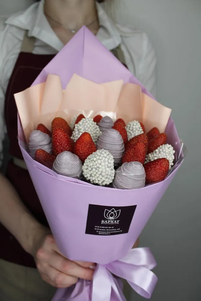 Мы собираем клубничные букеты по весу, а не по штукам. Количество, форма и размер ягод могут отличаться — ведь каждая ягода уникальна.