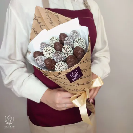 Состав: клубника в шоколаде 220 г. Букет из свежей клубники в бельгийском шоколаде. Клубника держится на каркасе из шпажек. Готовый букет упаковывается в прозрачную слюду. Фирменная открытка-инструкция по хранению — в подарок. Этот букет — идеальный способ выразить чувства: ко дню рождения, годовщине, 8 Марта, 14 Февраля, Дню матери, Дню учителя, Дню бабушки и дедушки или просто в знак внимания и заботы. Букет из клубники — съедобный букет — отличный подарок бабушке, маме, любимой женщине, жене, подруге, сестре, друзьям и коллеге.
