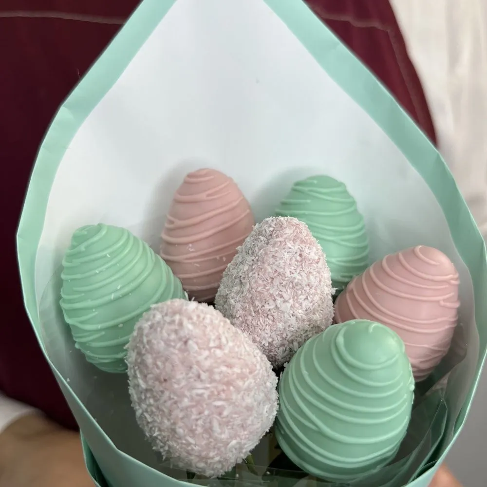 Мы собираем клубничные букеты по весу, а не по штукам. Количество, форма и размер ягод могут отличаться — ведь каждая ягода уникальна.