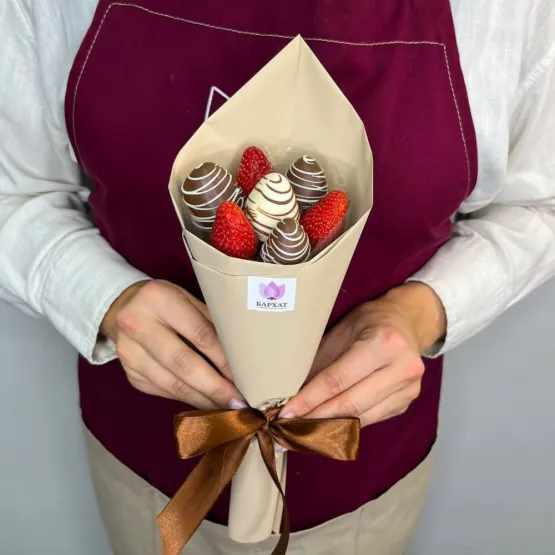 Мы собираем клубничные букеты по весу, а не по штукам. Количество, форма и размер ягод могут отличаться — ведь каждая ягода уникальна.