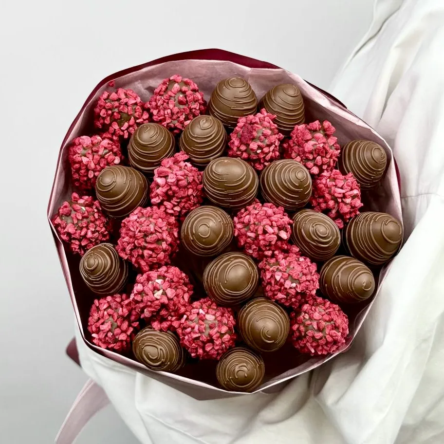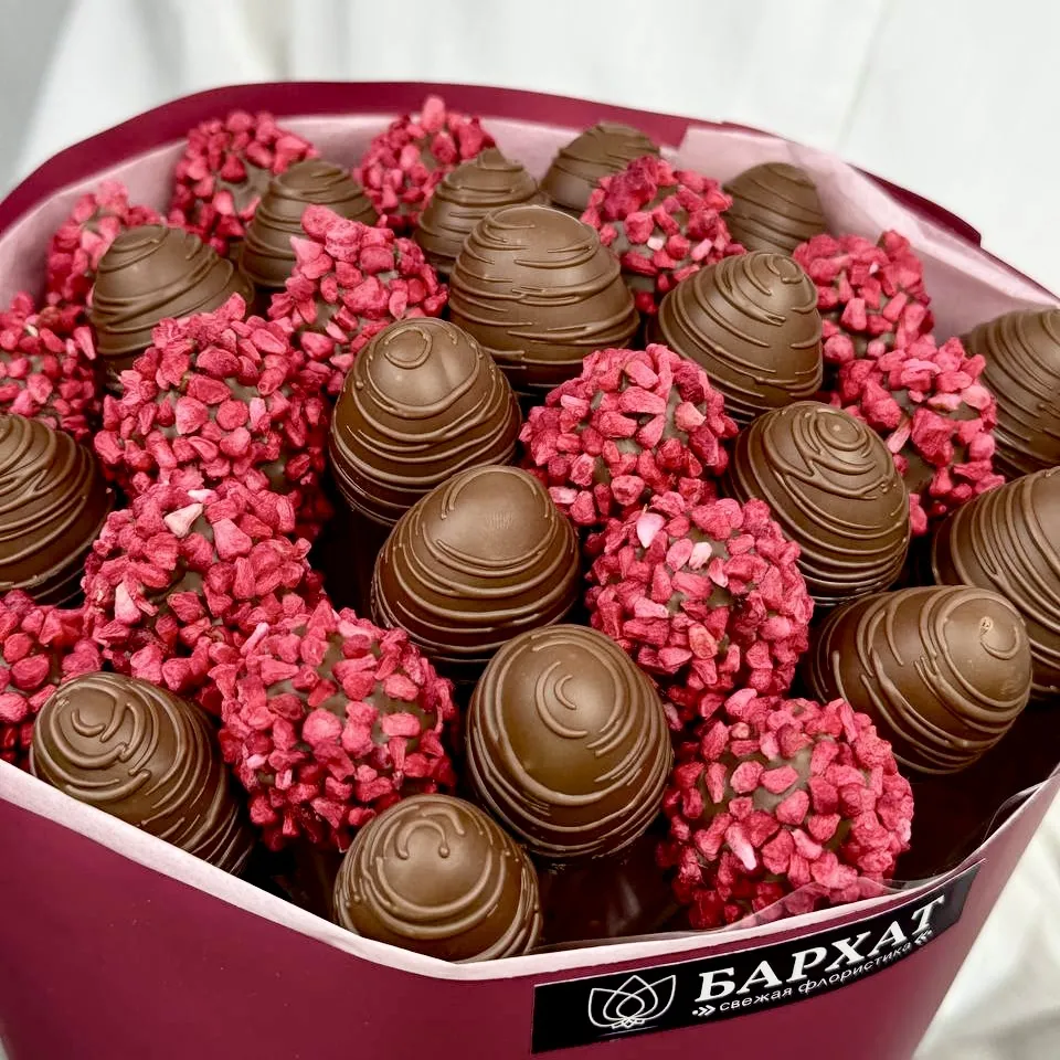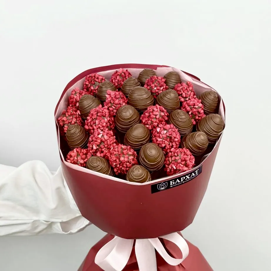 *Обратите внимание: изображение в карточке товара носит иллюстративный характер — реальный букет может незначительно отличаться от фото (например, по размеру клубники, форме и сборке). Точные размеры букета указаны в карточке товара.