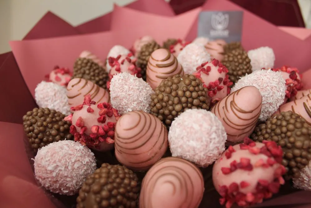 Мы собираем клубничные букеты по весу, а не по штукам. Количество, форма и размер ягод могут отличаться — ведь каждая ягода уникальна.