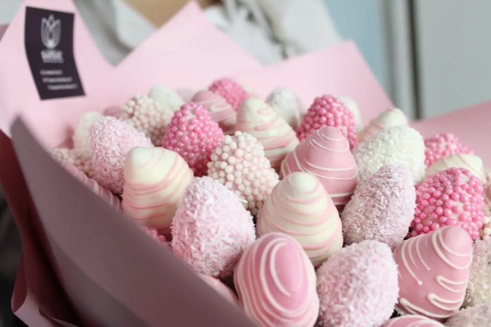 Мы собираем клубничные букеты по весу, а не по штукам. Количество, форма и размер ягод могут отличаться — ведь каждая ягода уникальна.