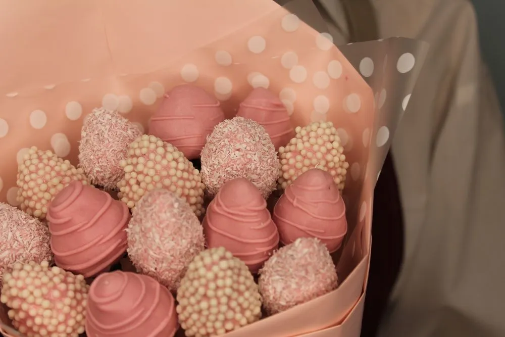 Мы собираем клубничные букеты по весу, а не по штукам. Количество, форма и размер ягод могут отличаться — ведь каждая ягода уникальна.