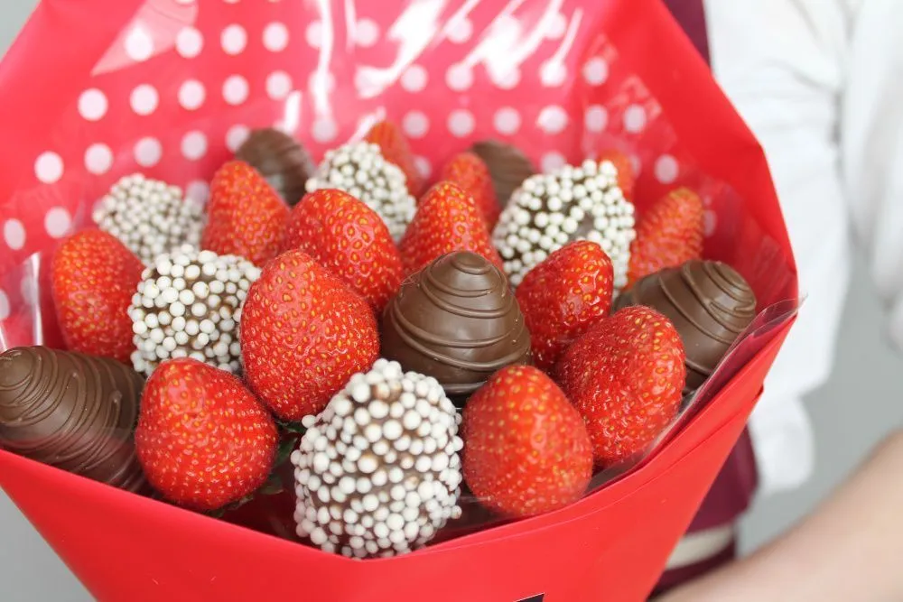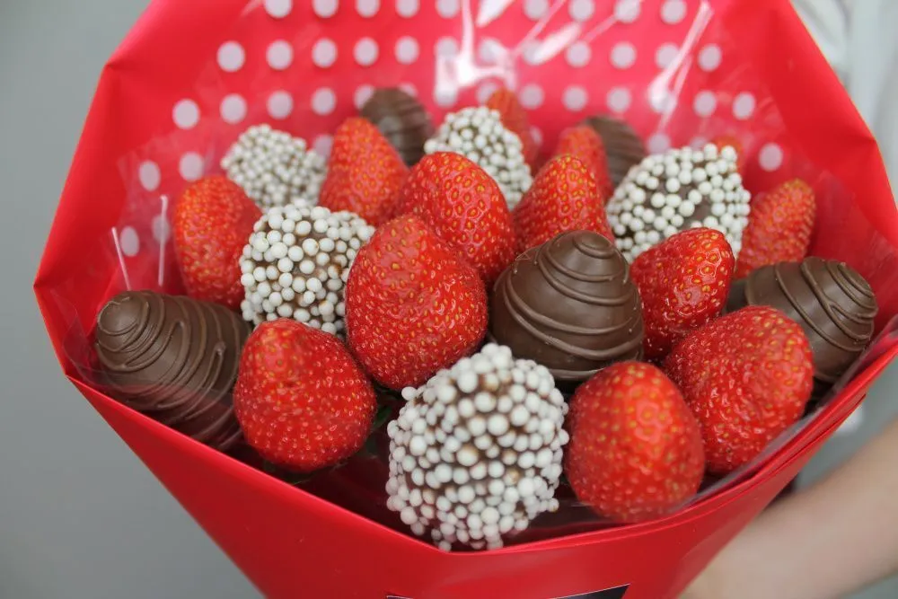 Мы собираем клубничные букеты по весу, а не по штукам. Количество, форма и размер ягод могут отличаться — ведь каждая ягода уникальна.