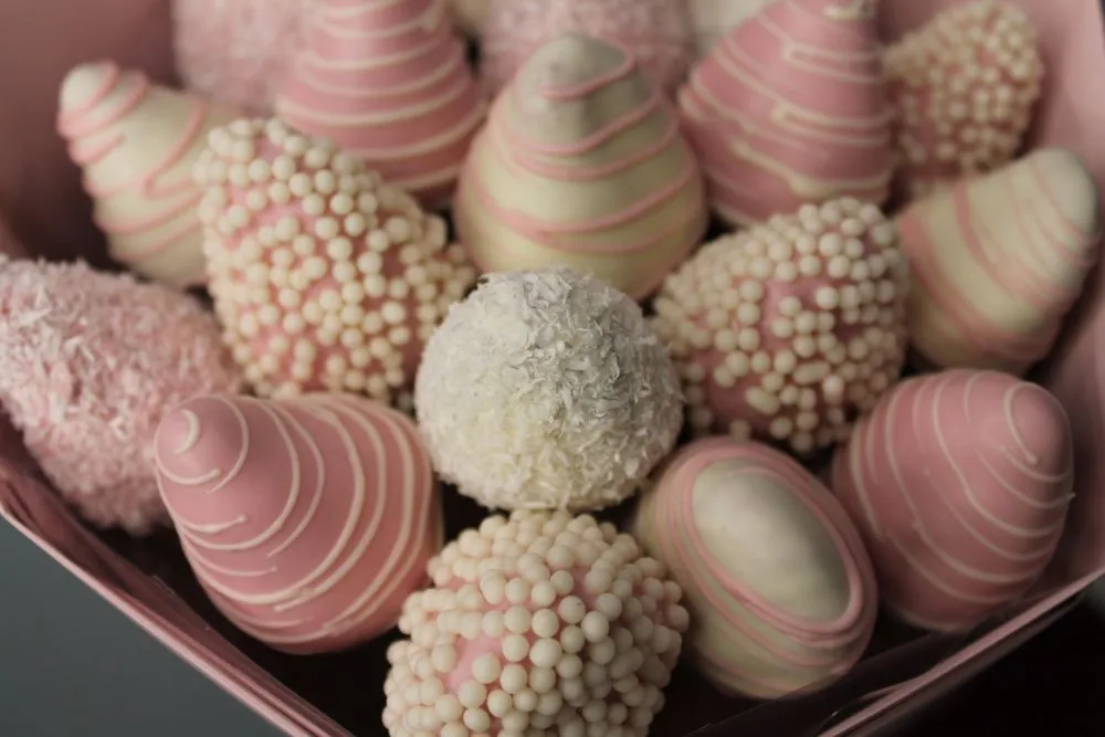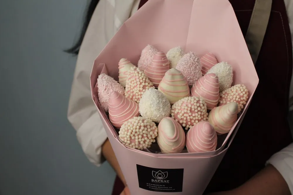 Мы собираем клубничные букеты по весу, а не по штукам. Количество, форма и размер ягод могут отличаться — ведь каждая ягода уникальна.