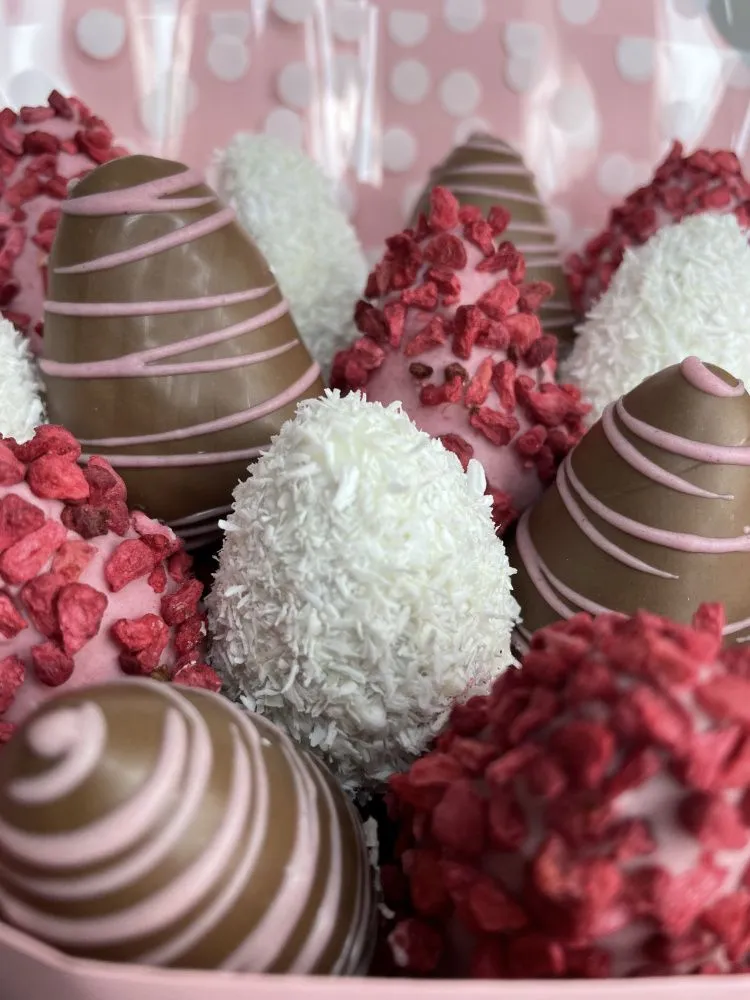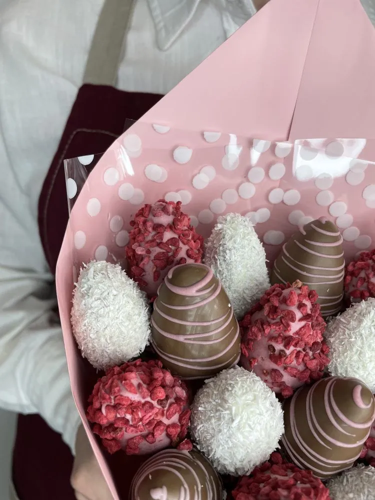 Мы собираем клубничные букеты по весу, а не по штукам. Количество, форма и размер ягод могут отличаться — ведь каждая ягода уникальна.