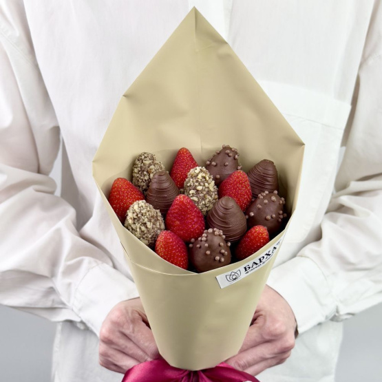 *Обратите внимание: изображение в карточке товара носит иллюстративный характер — реальный букет может незначительно отличаться от фото (например, по размеру клубники, форме и сборке). Точные размеры букета указаны в карточке товара.
