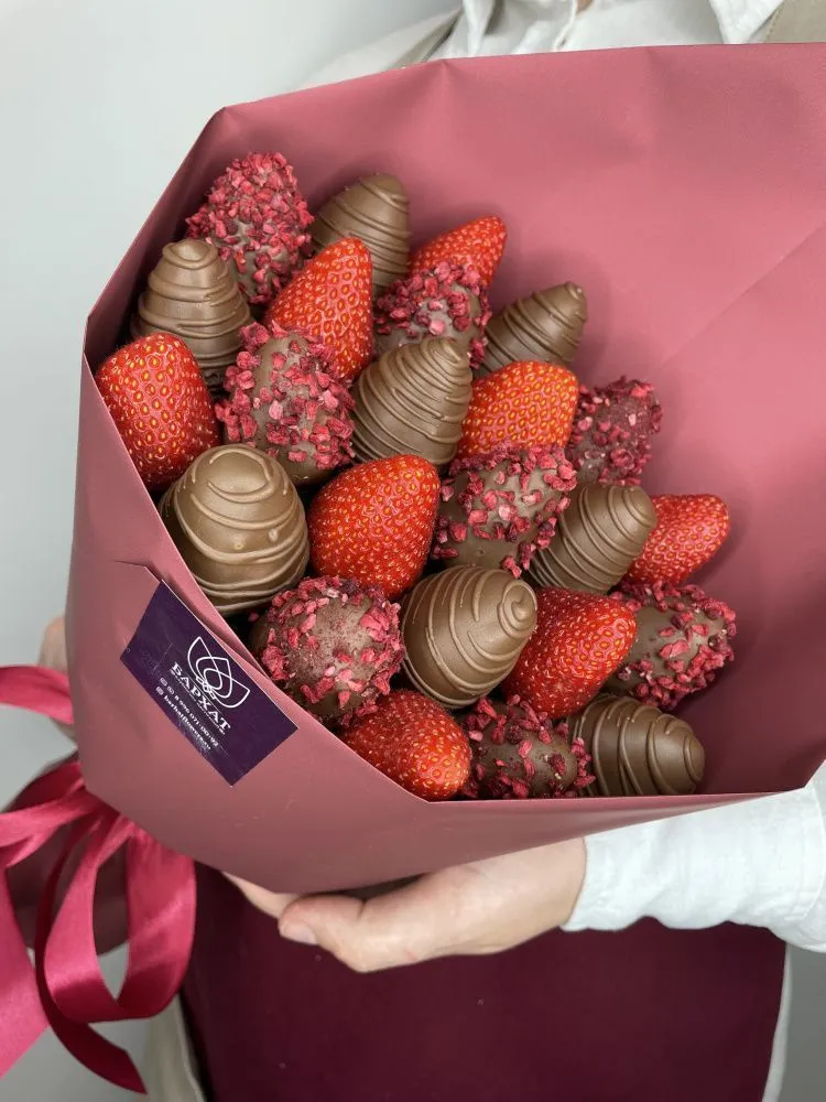 Состав: клубника в шоколаде 175 г, клубника без шоколада 175 г. Букет из свежей клубники в бельгийском шоколаде. Клубника держится на каркасе из шпажек. Готовый букет упаковывается в прозрачную слюду. Фирменная открытка-инструкция по хранению — в подарок. Этот букет — идеальный способ выразить чувства: ко дню рождения, годовщине, 8 Марта, 14 Февраля, Дню матери, Дню учителя, Дню бабушки и дедушки или просто в знак внимания и заботы. Букет из клубники — съедобный букет — отличный подарок бабушке, маме, любимой женщине, жене, подруге, сестре, друзьям и коллеге.