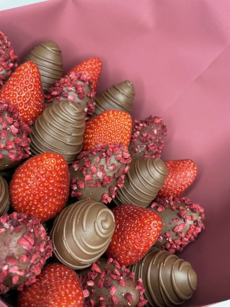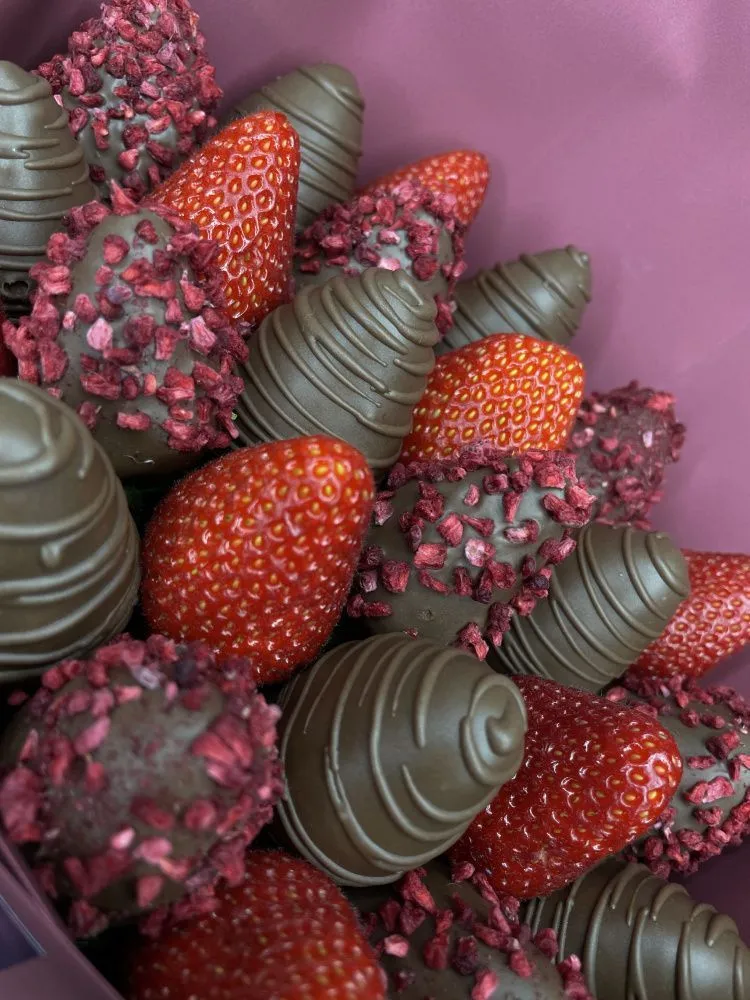 Мы собираем клубничные букеты по весу, а не по штукам. Количество, форма и размер ягод могут отличаться — ведь каждая ягода уникальна.