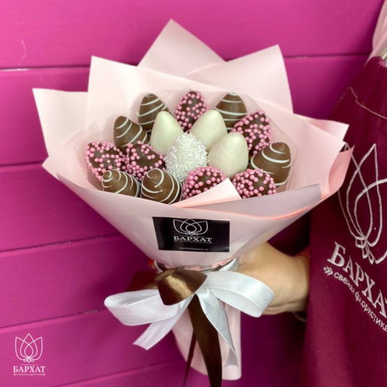 Мы собираем клубничные букеты по весу, а не по штукам. Количество, форма и размер ягод могут отличаться — ведь каждая ягода уникальна.