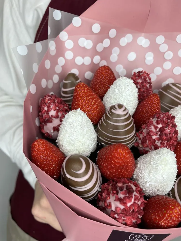 Мы собираем клубничные букеты по весу, а не по штукам. Количество, форма и размер ягод могут отличаться — ведь каждая ягода уникальна.