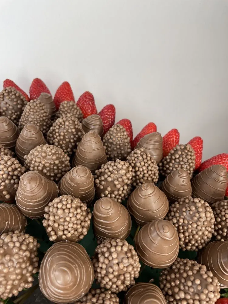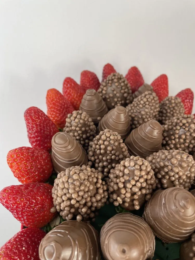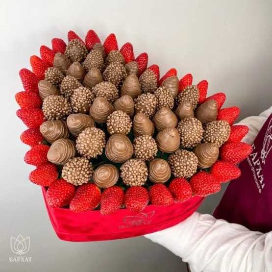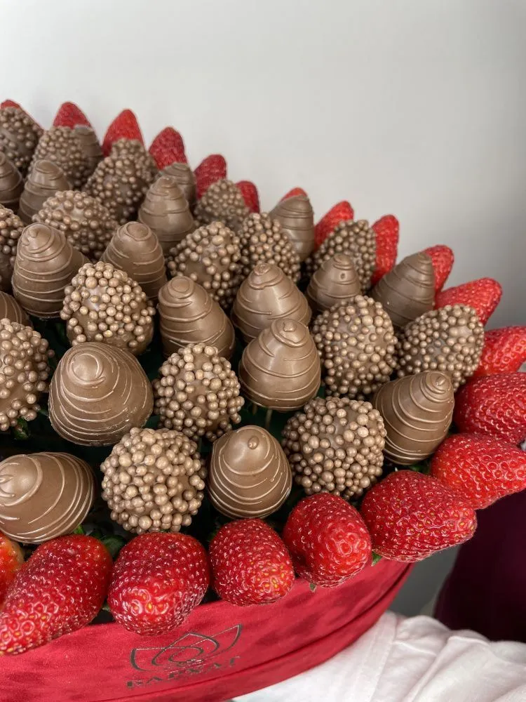 Мы собираем клубничные букеты по весу, а не по штукам. Количество, форма и размер ягод могут отличаться — ведь каждая ягода уникальна.