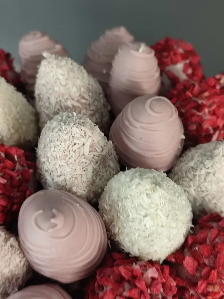 Клубника в шоколаде, Посыпка: Кокосовая стружка, Посыпка: Сублимированная малина