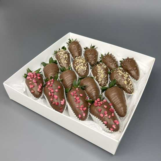 Состав: клубника в шоколаде 16 шт. Свежая клубника в бельгийском шоколаде — идеальный способ выразить чувства: ко дню рождения, годовщине, 8 Марта, 14 Февраля, Дню матери, Дню учителя, Дню бабушки и дедушки или просто в знак внимания и заботы. Фирменная открытка-инструкция по хранению — в подарок. Коробочка клубники в шоколаде — отличный подарок бабушке, маме, любимой женщине, жене, подруге, сестре, друзьям и коллеге.