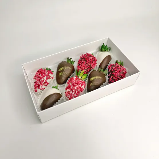 Мы собираем клубничные букеты по весу, а не по штукам. Количество, форма и размер ягод могут отличаться — ведь каждая ягода уникальна.