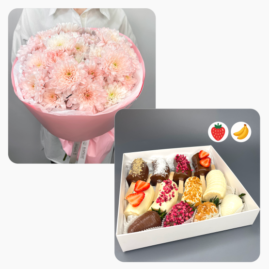 Этот набор — двойной сюрприз для особых моментов. В нём сочетаются свежие цветы и коробочка с изысканными десертами: клубникой сорта Альбион и нежнейшими бананами в фирменном шоколаде с различными посыпками. Идеальный выбор для трогательного признания на 14 февраля (День Святого Валентина), День рождения, 8 Марта, годовщину или без повода. Он создаёт незабываемое впечатление, говоря о ваших чувствах сразу двумя способами. Это роскошный и вкусный сюрприз для любимой женщины, девушки, жены, мамы, подруги или коллеги.