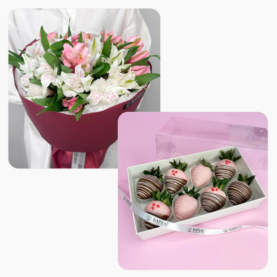 Состав: альстромерия 4 шт., альстромерия 3 шт., клубника в шоколаде 8 шт.