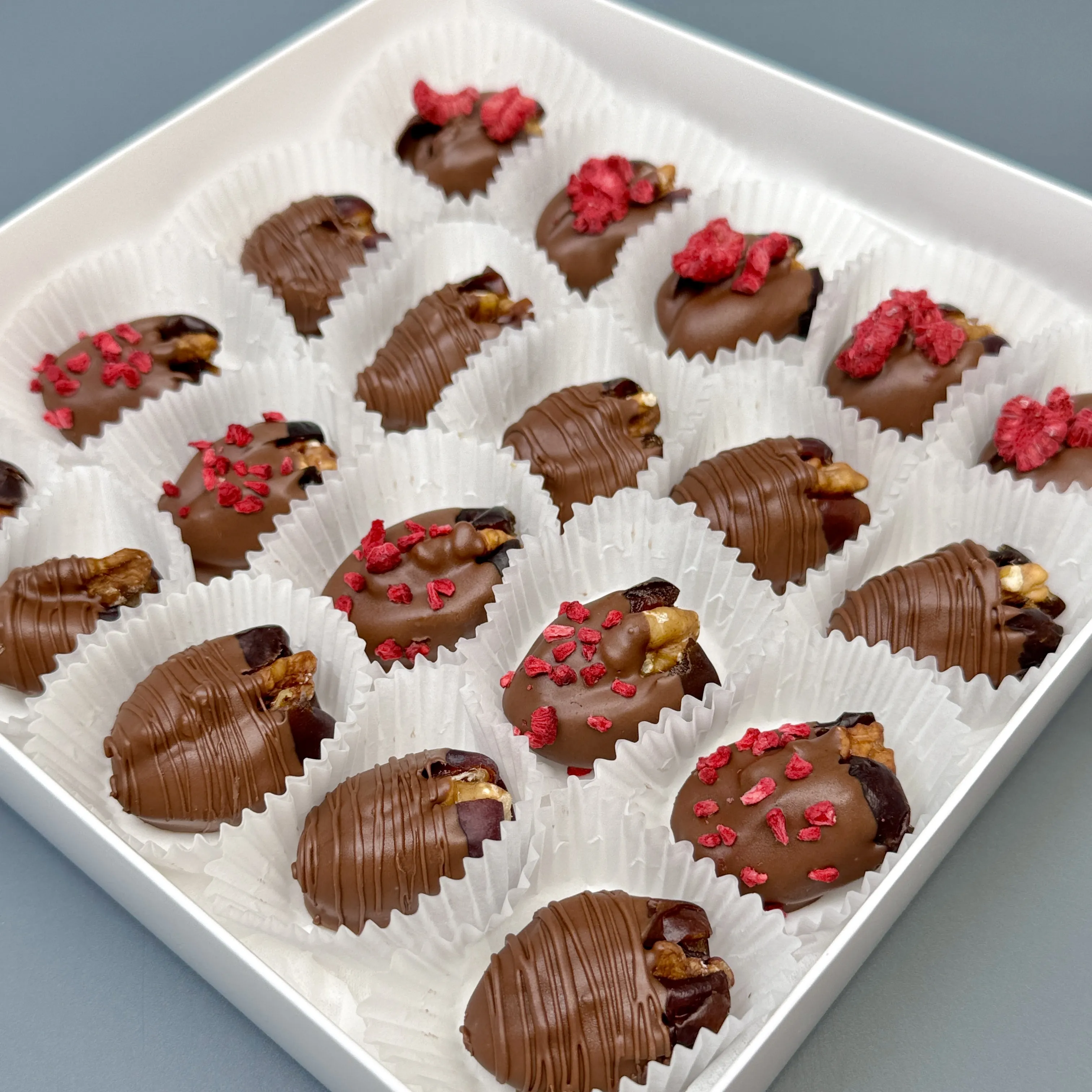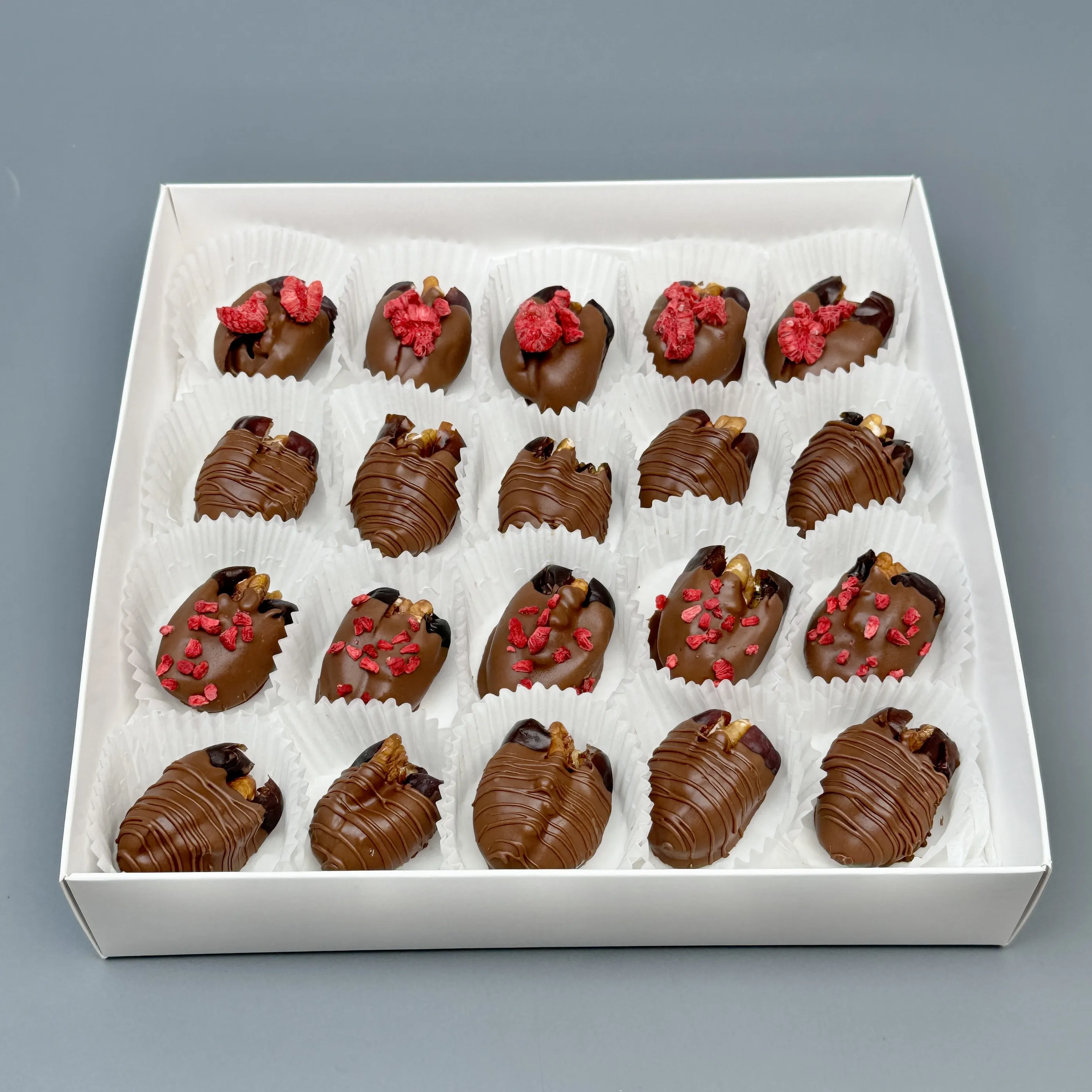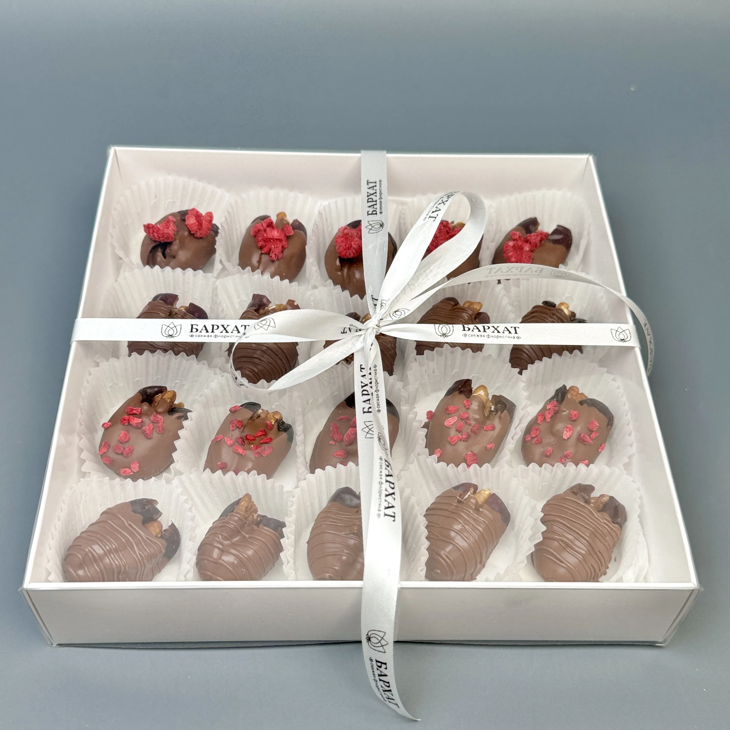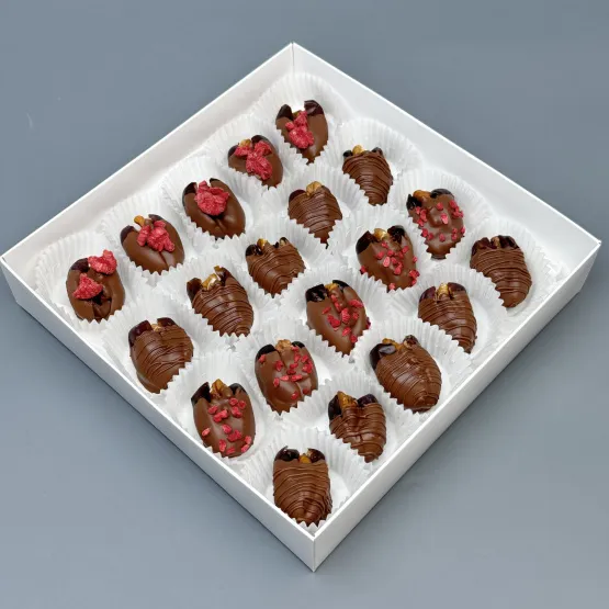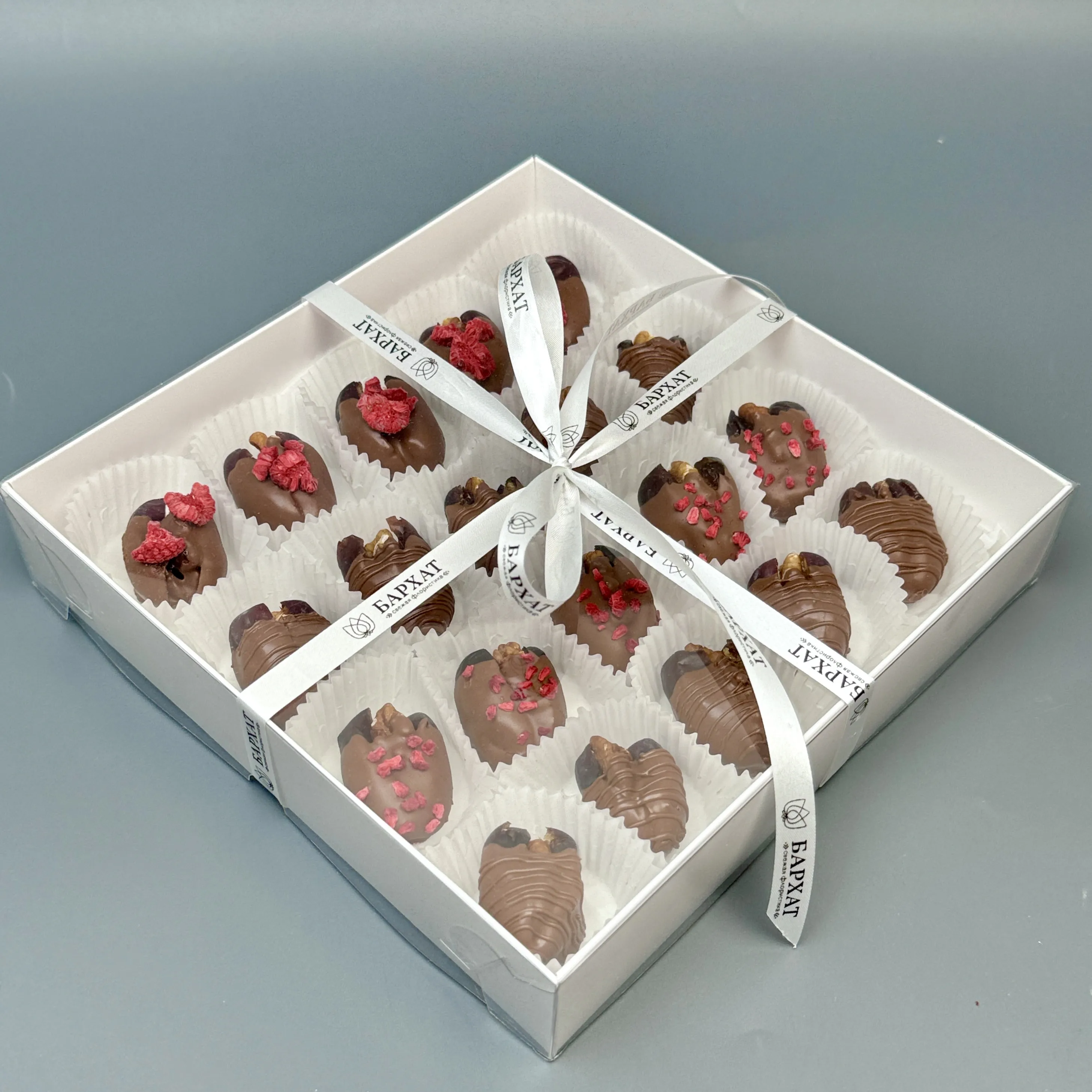 Состав: финики 20 шт. в шоколаде, с добавлением грецкого ореха и сублимированной малины.  НОВИНКА! Восточная роскошь нового десерта: медовые финики, укутанные в фирменный шоколадный купаж. Яркий вкус  фиников дополняет грецкий орех внутри, придавая особенную текстуру и вкус десерту. Стильная открытка-инструкция в качестве бесплатного бонуса. Отличный подарок бабушке, маме, любимой женщине, жене, подруге, сестре, мужу, брату, дедушке, друзьям и коллеге.