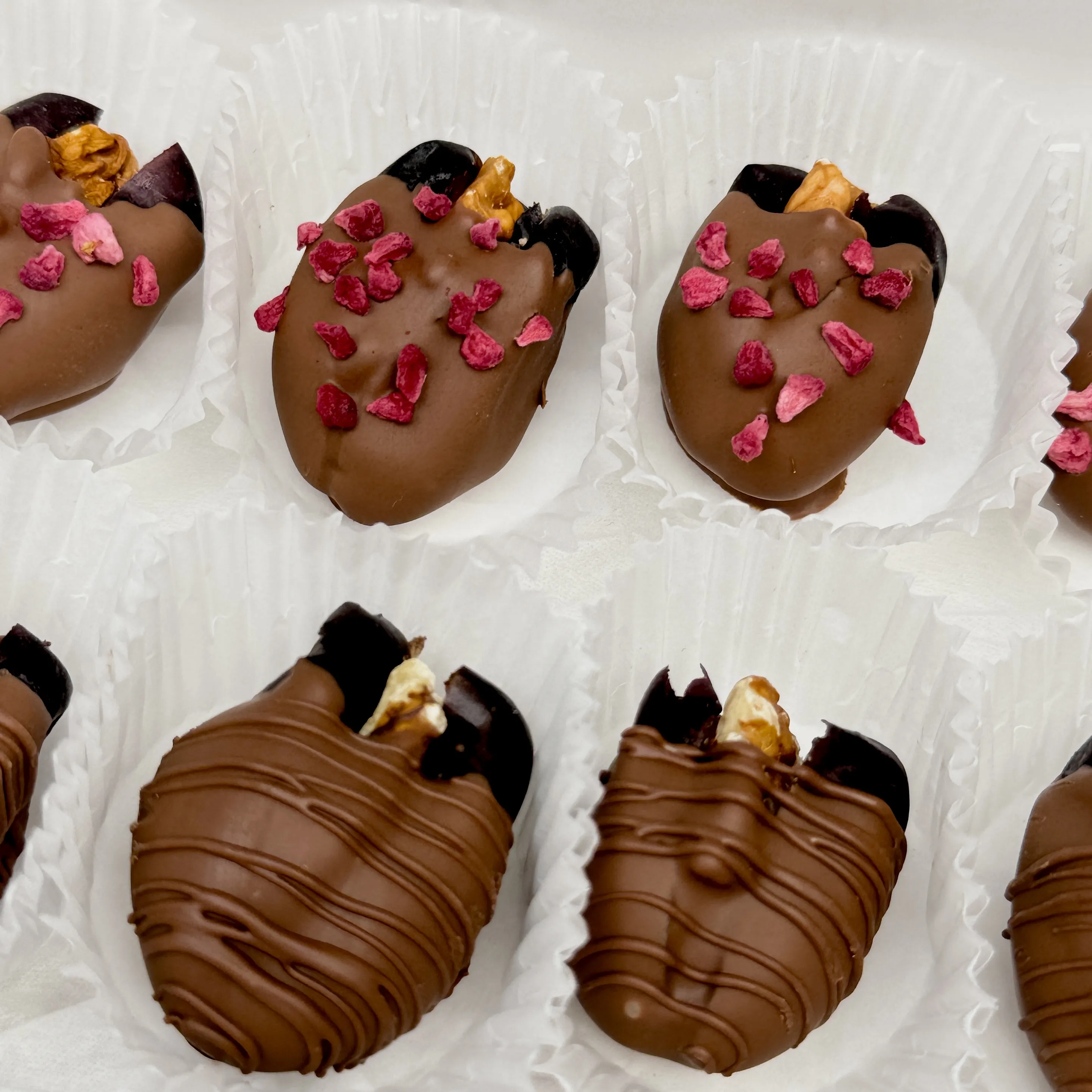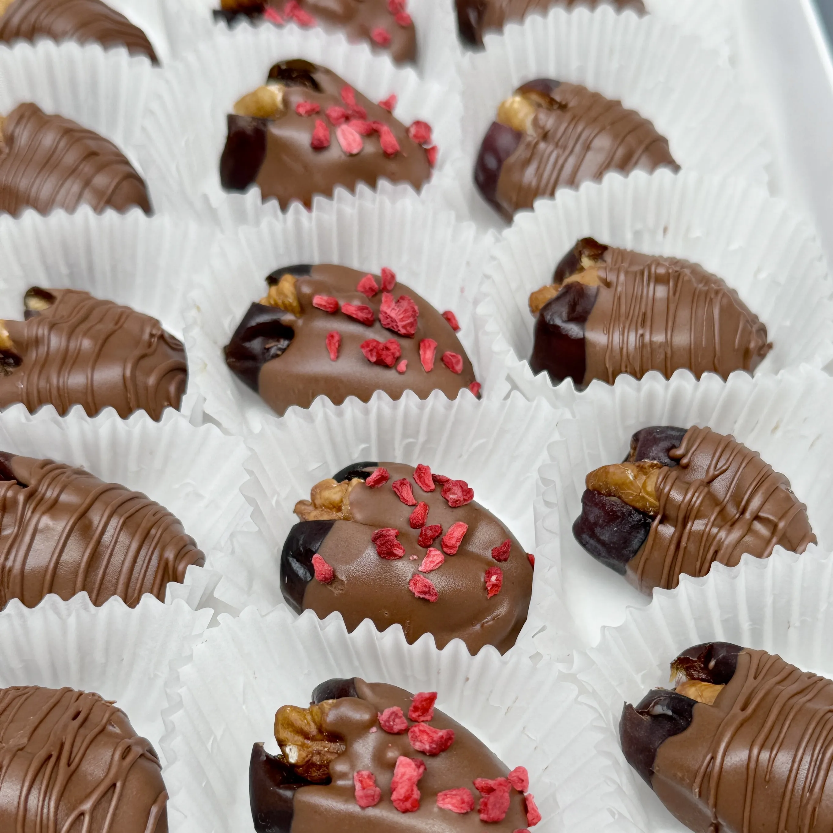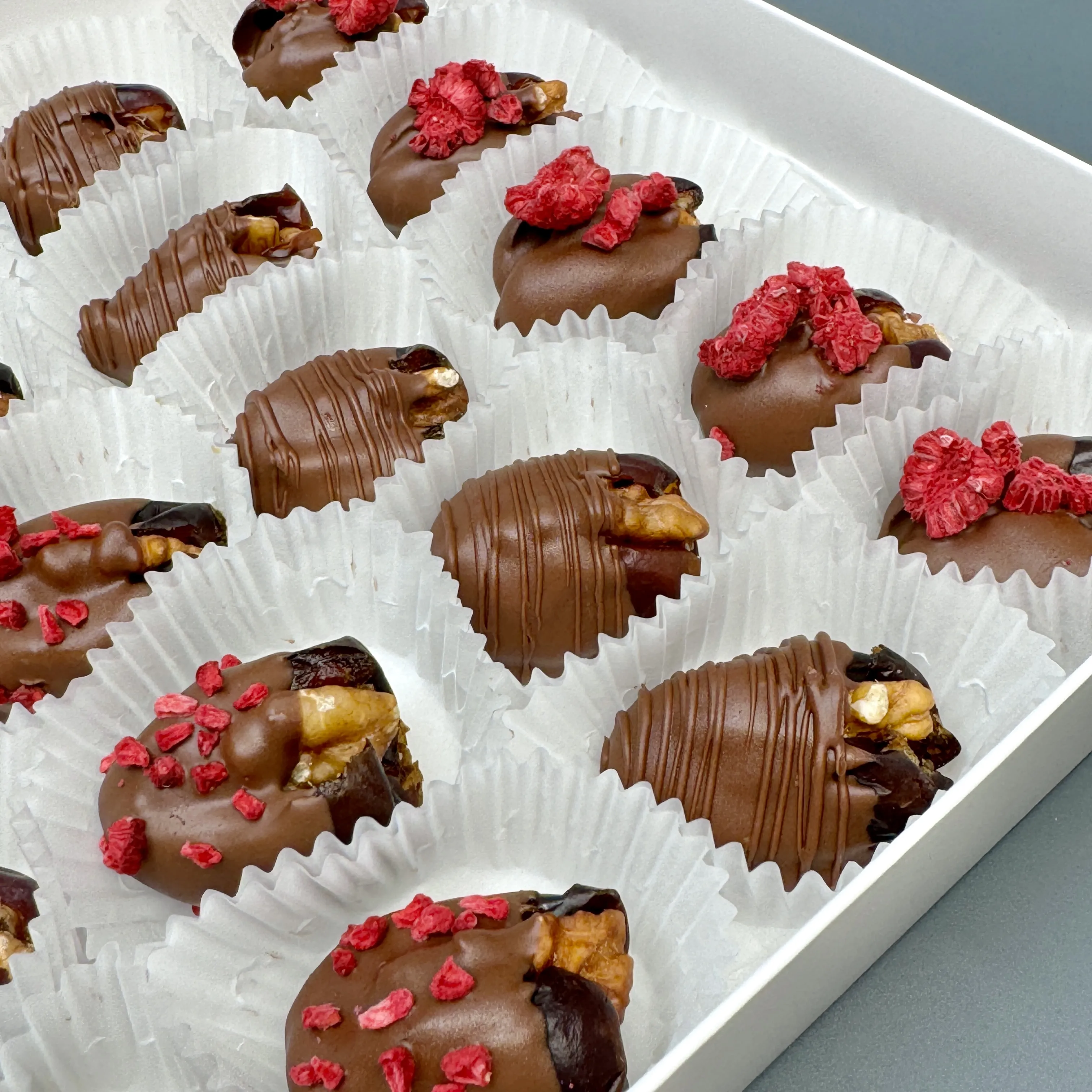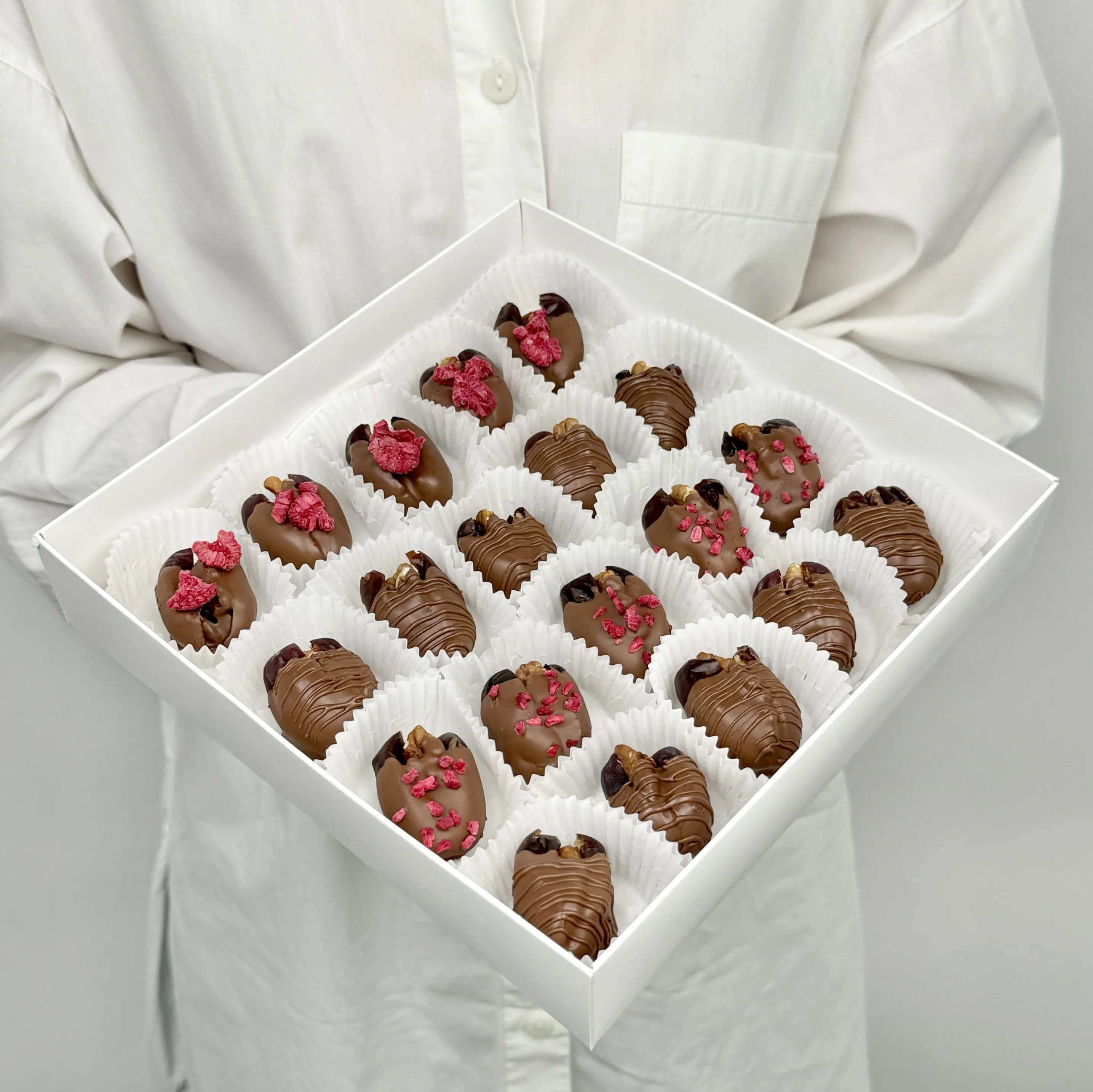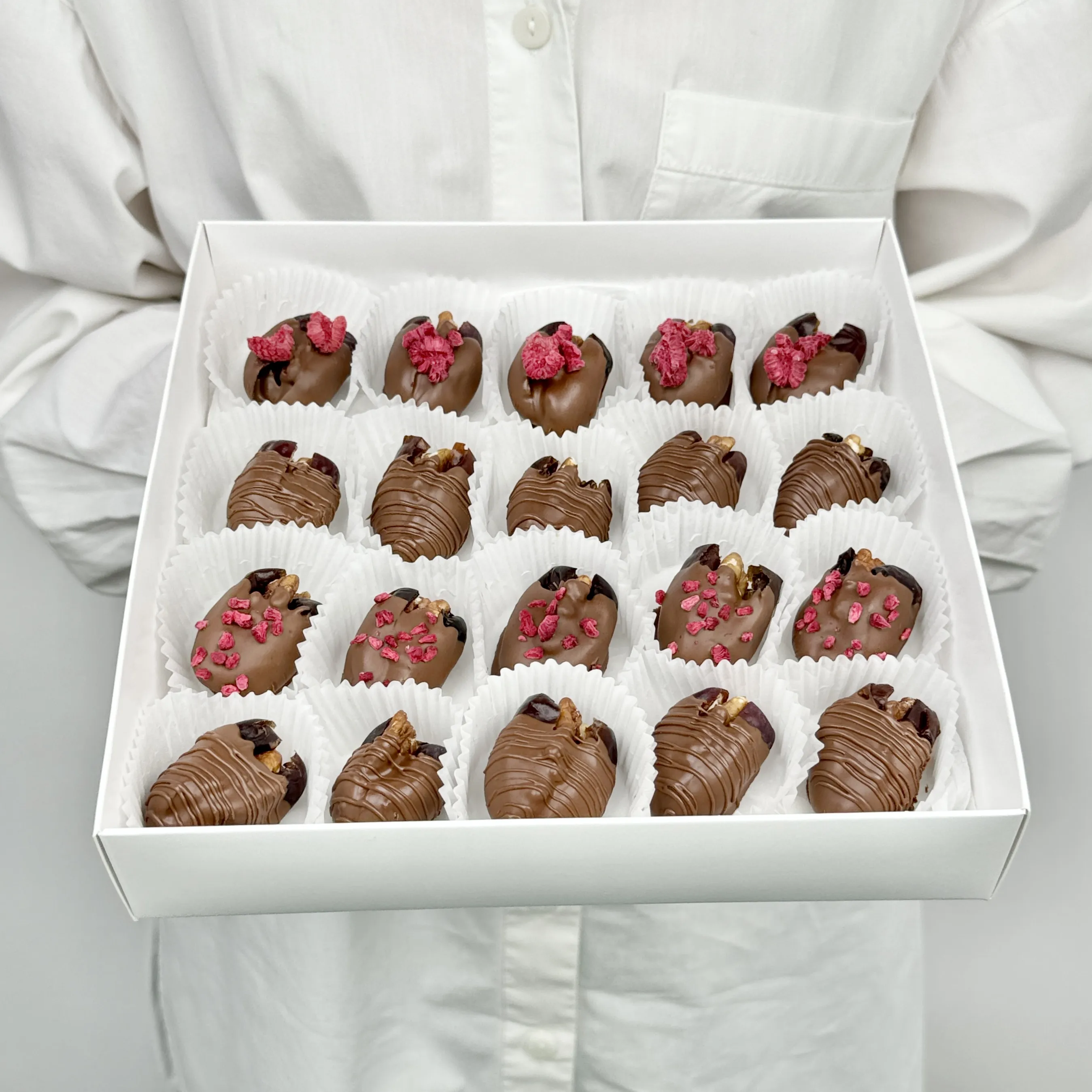Состав: финики 20 шт. в шоколаде, с добавлением грецкого ореха и сублимированной малины.  НОВИНКА! Восточная роскошь нового десерта: медовые финики, укутанные в фирменный шоколадный купаж. Яркий вкус  фиников дополняет грецкий орех внутри, придавая особенную текстуру и вкус десерту. Стильная открытка-инструкция в качестве бесплатного бонуса. Отличный подарок бабушке, маме, любимой женщине, жене, подруге, сестре, мужу, брату, дедушке, друзьям и коллеге.