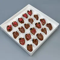 Мы собираем клубничные букеты по весу, а не по штукам. Количество, форма и размер ягод могут отличаться — ведь каждая ягода уникальна.