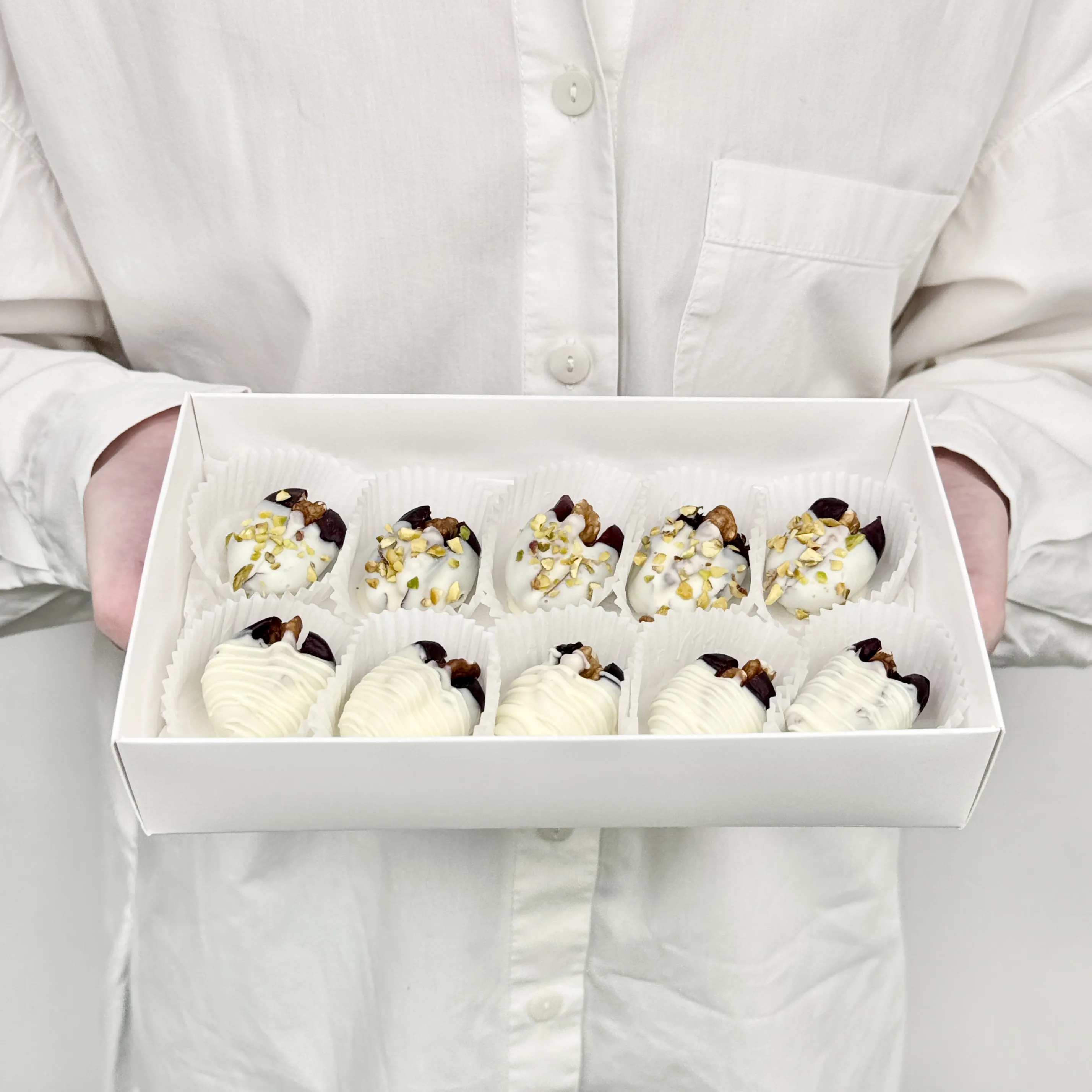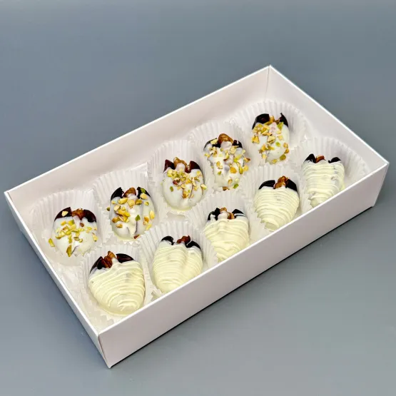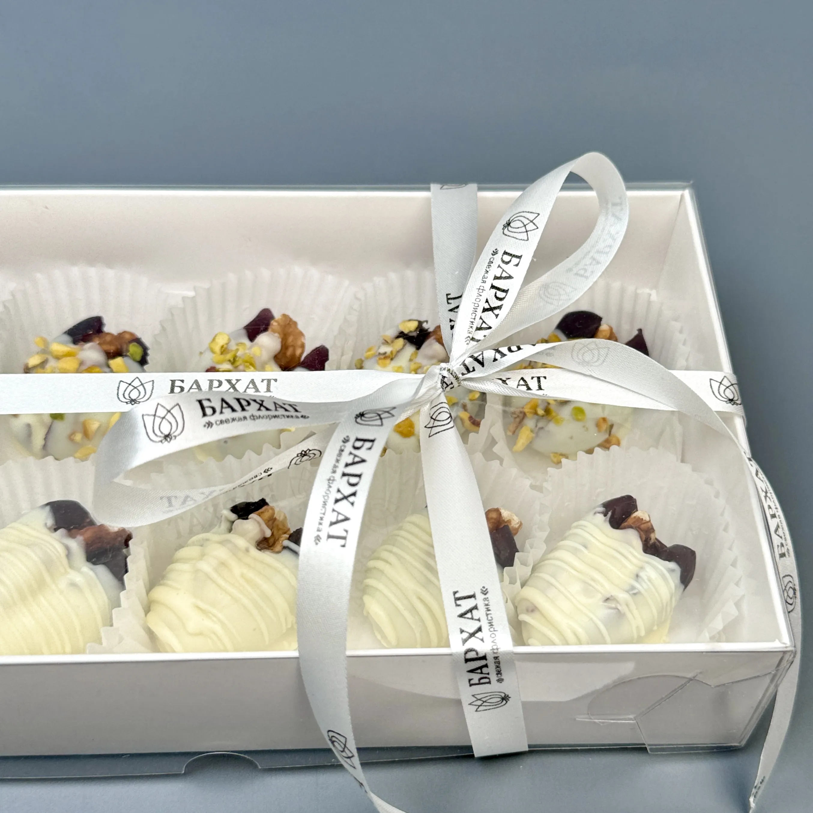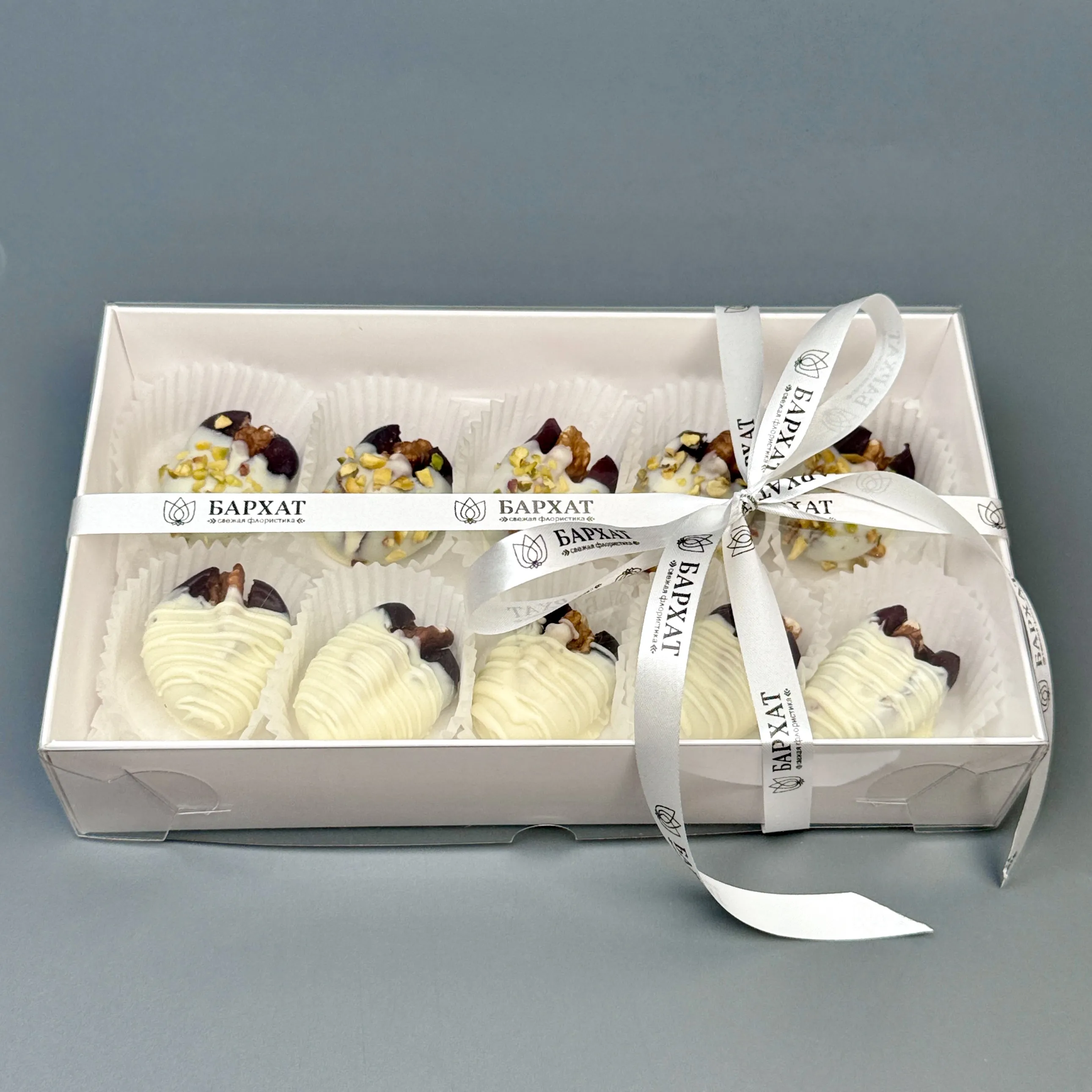 Состав: финики 10 шт. в белом шоколаде, с добавлением грецкого ореха и измельченной фисташки. НОВИНКА! Восточная роскошь нового десерта в белом исполнении: медовые финики, укутанные в фирменный шоколадный купаж. Яркий вкус  фиников дополняет грецкий орех внутри, придавая особенные текстуру и вкус десерту. Измельченная фисташка дополняет композицию вкусов. Стильная открытка-инструкция в качестве бесплатного бонуса. Отличный подарок бабушке, маме, любимой женщине, жене, подруге, сестре, мужу, брату, дедушке, друзьям и коллеге.