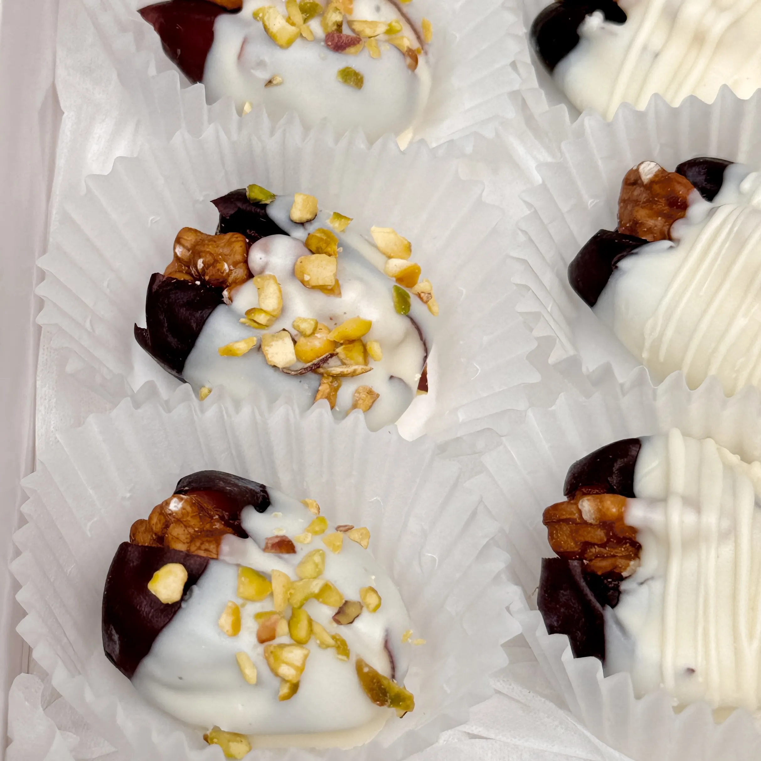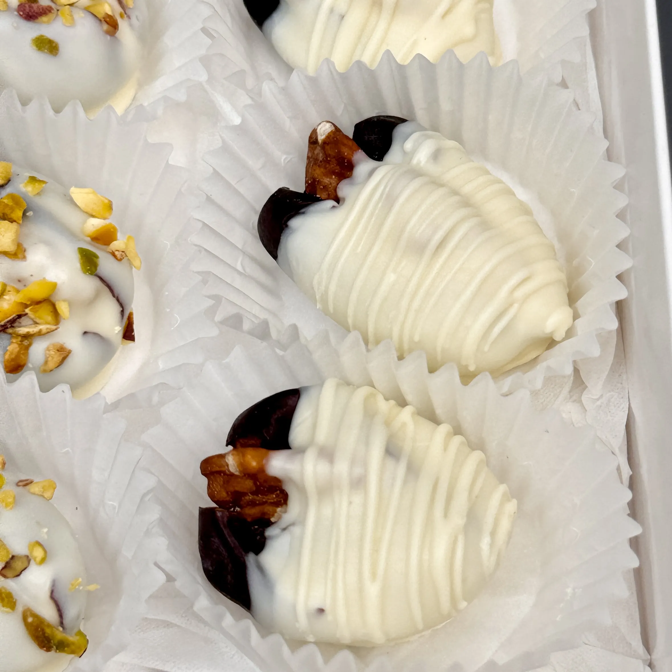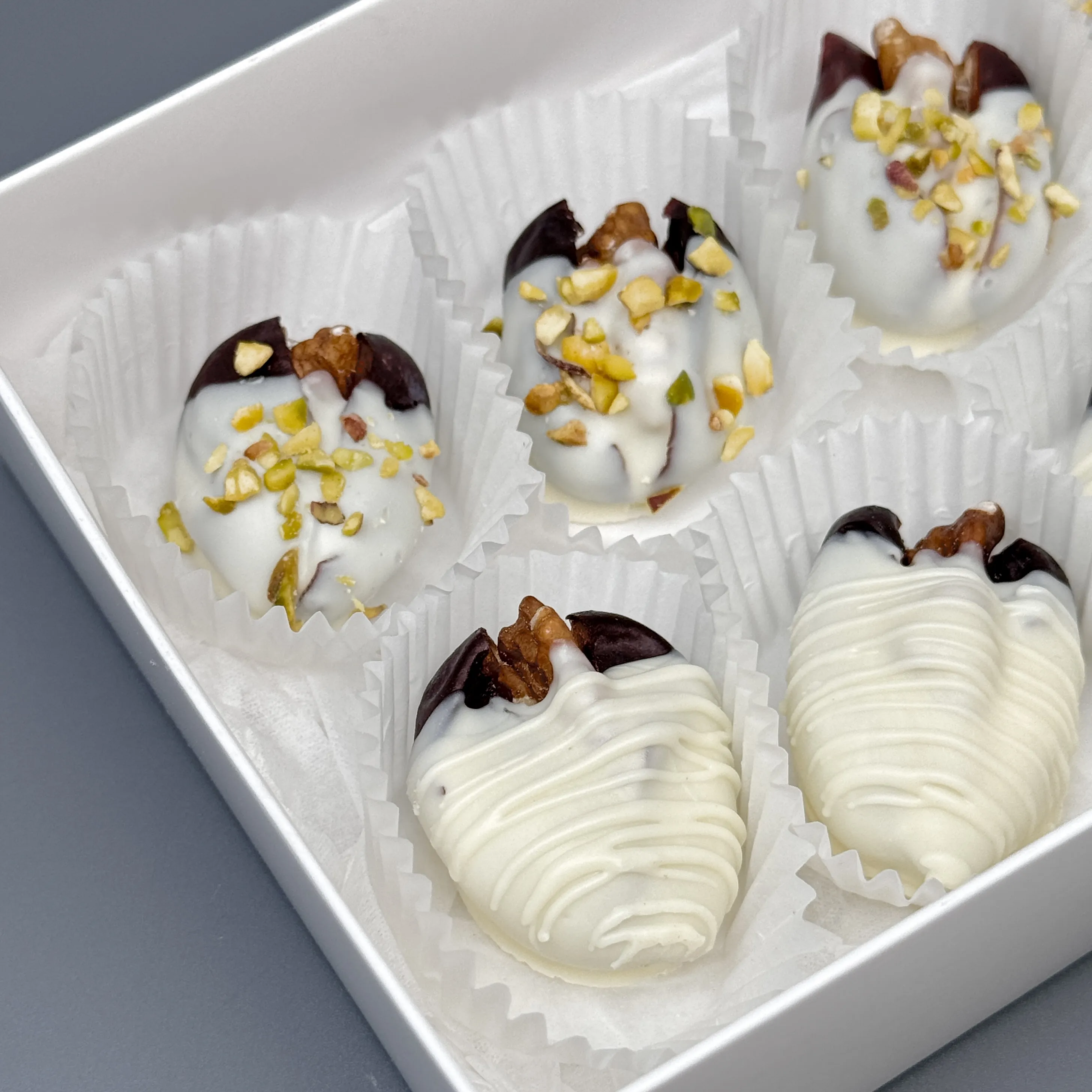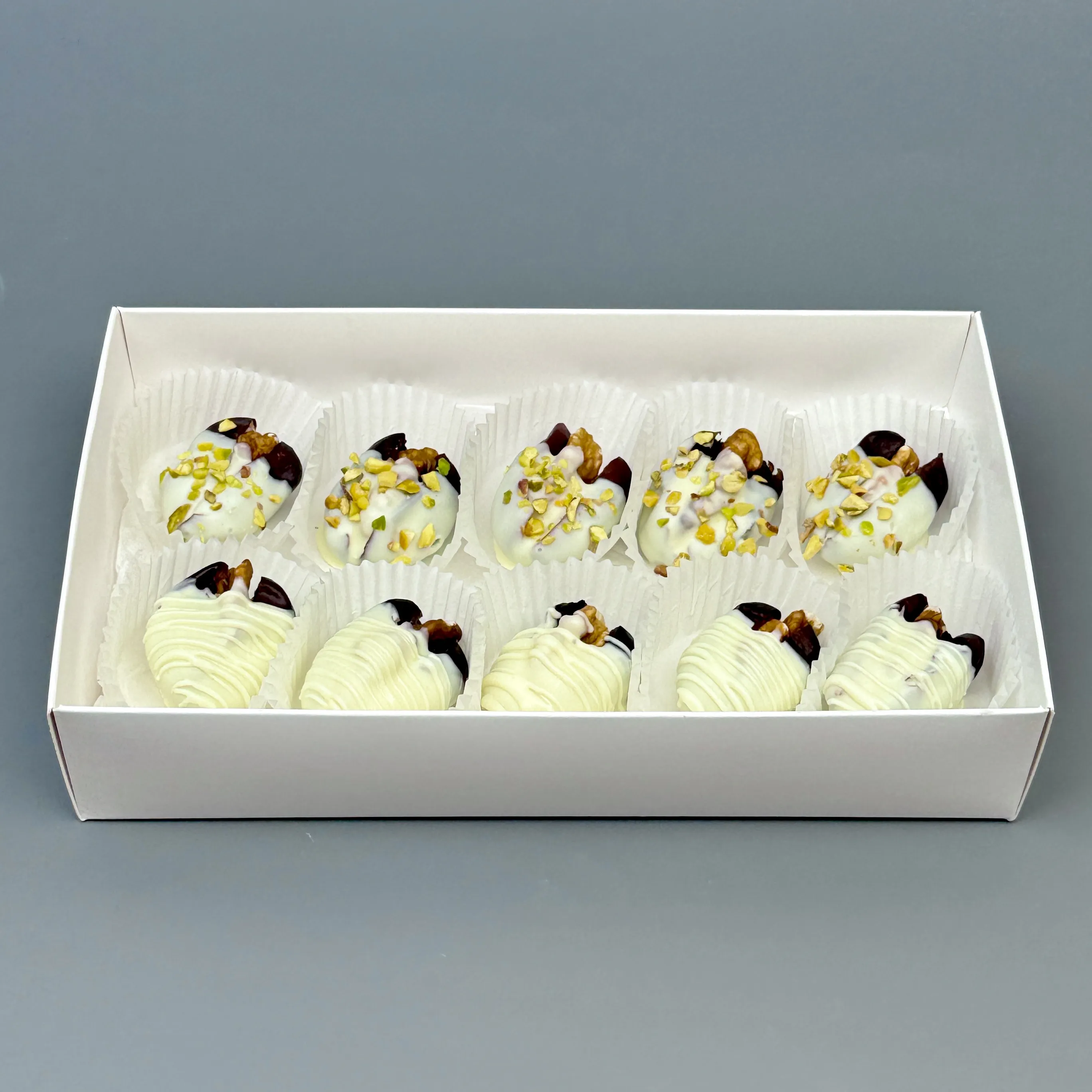 Состав: финики 10 шт. в белом шоколаде, с добавлением грецкого ореха и измельченной фисташки. НОВИНКА! Восточная роскошь нового десерта в белом исполнении: медовые финики, укутанные в фирменный шоколадный купаж. Яркий вкус  фиников дополняет грецкий орех внутри, придавая особенные текстуру и вкус десерту. Измельченная фисташка дополняет композицию вкусов. Стильная открытка-инструкция в качестве бесплатного бонуса. Отличный подарок бабушке, маме, любимой женщине, жене, подруге, сестре, мужу, брату, дедушке, друзьям и коллеге.